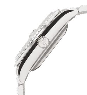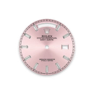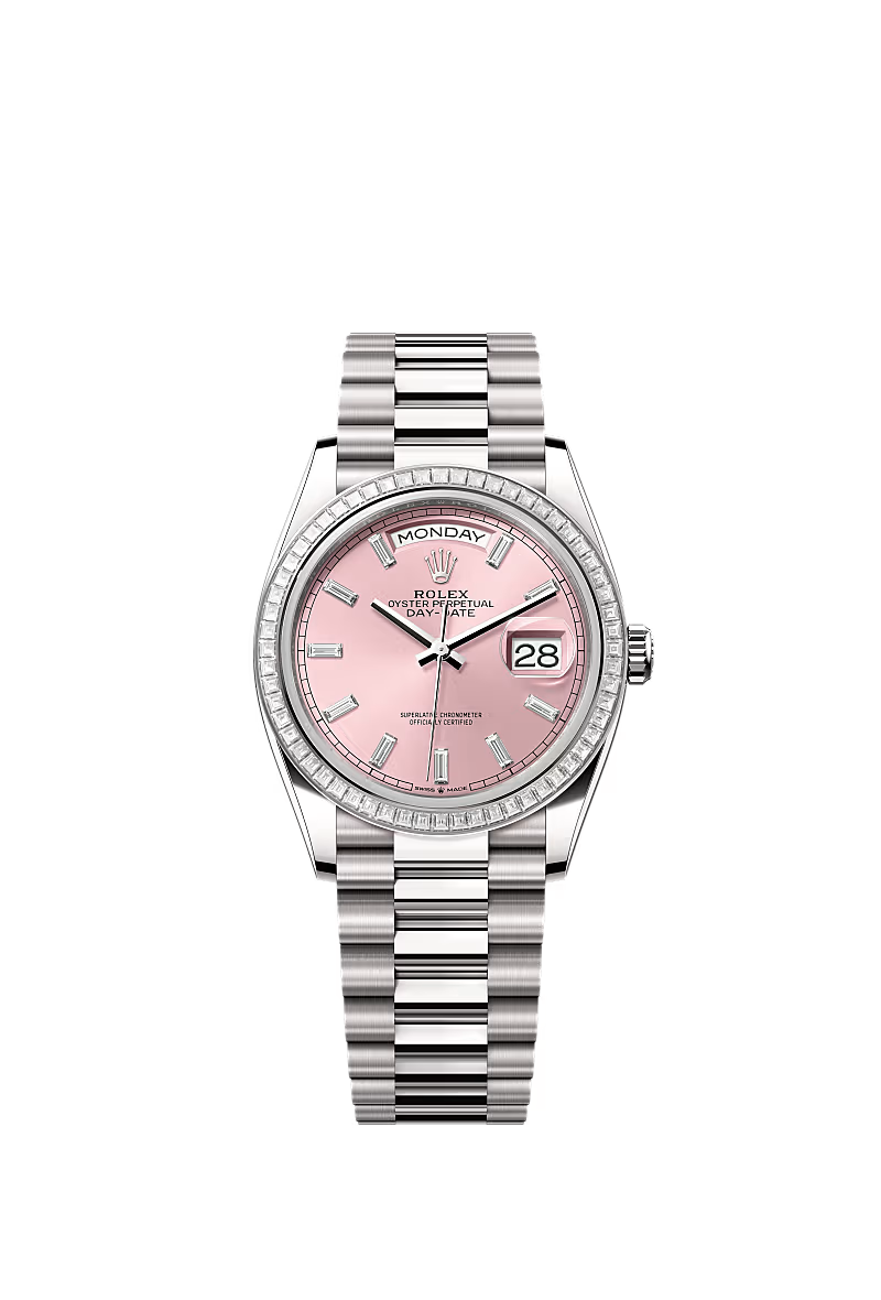 تتميز ساعة أويستر بربتشوال داي ديت ۳٦ المصنوعة من ذهب أبيض عيار ١٨ قيراطًا بمينا زهري مرصَّع بالألماس وبإطار مُرصّع بالألماس وبسوار بريزيدانت (President).