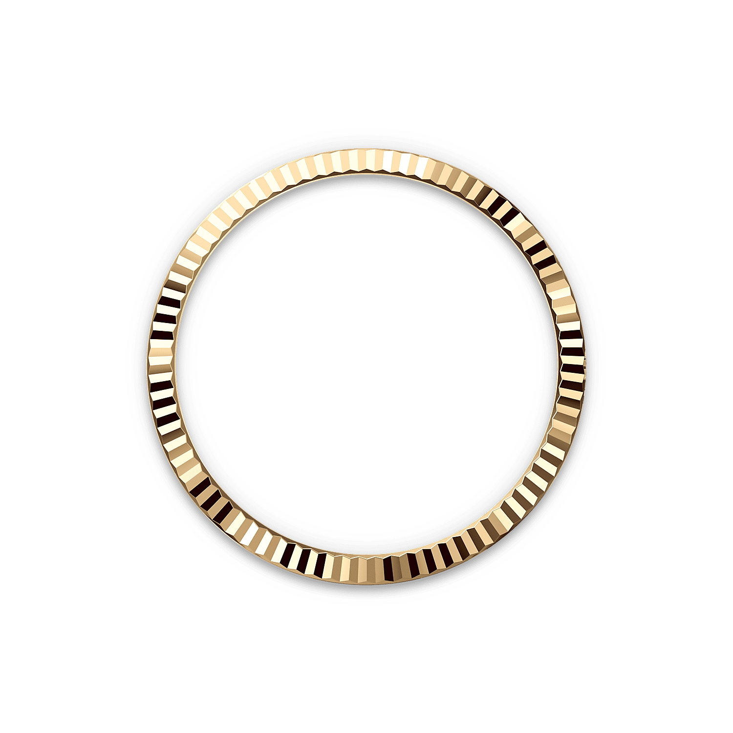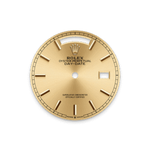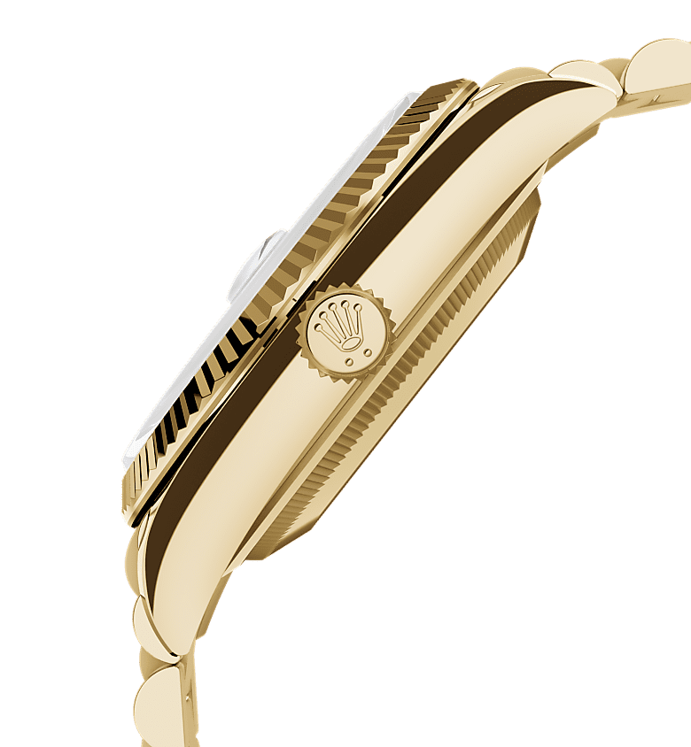 تتميز ساعة أويستر بربتشوال داي ديت ۳٦ المصنوعة من ذهب أصفر عيار ١٨ قيراطًا بمينا بلون الشامبين وبإطار مُخدّد وبسوار بريزيدانت (President).