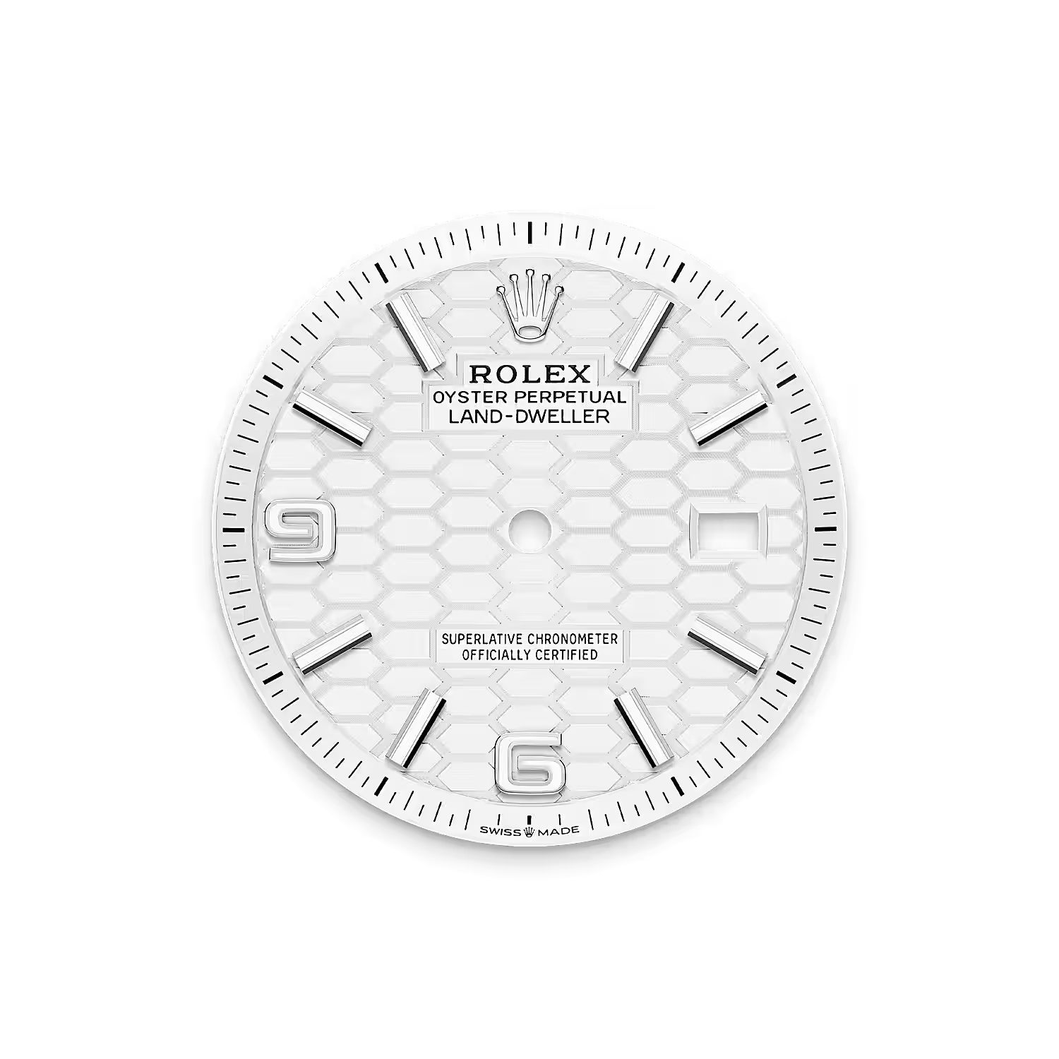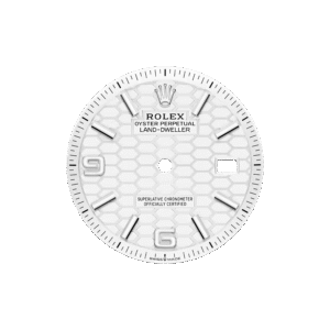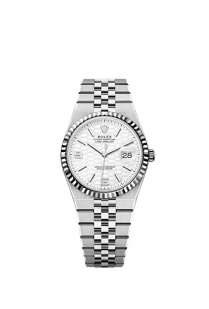 ساعة لاند دويلَر ٣٦ من فولاذ أويستر ستيل والذهب الأبيض المجهّزة بمينا أبيض ناصع، زخرفة أقراص العسل وسوار جوبيلي مسطّح.