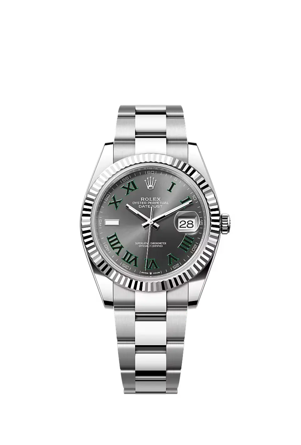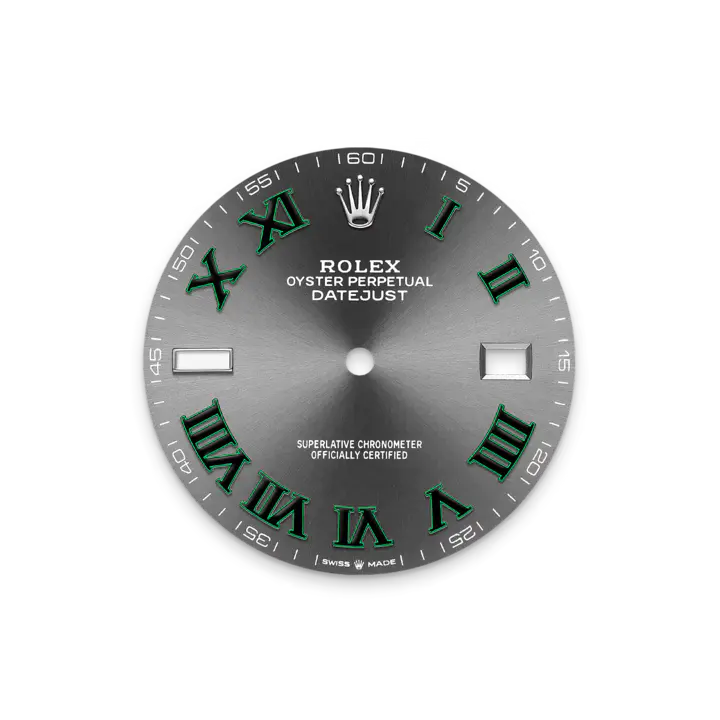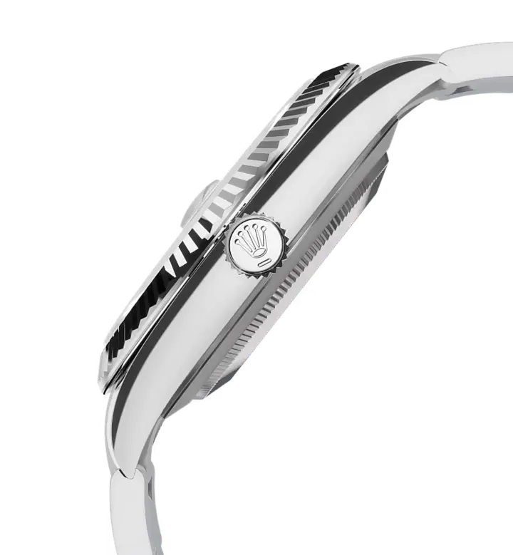 تتميز ساعة أويستر بربتشوال ديت جست ٤١ هذه المصنوعة من فولاذ أويستر ستيل والذهب الأبيض بمينا رمادي داكن وبسوار أويستر.