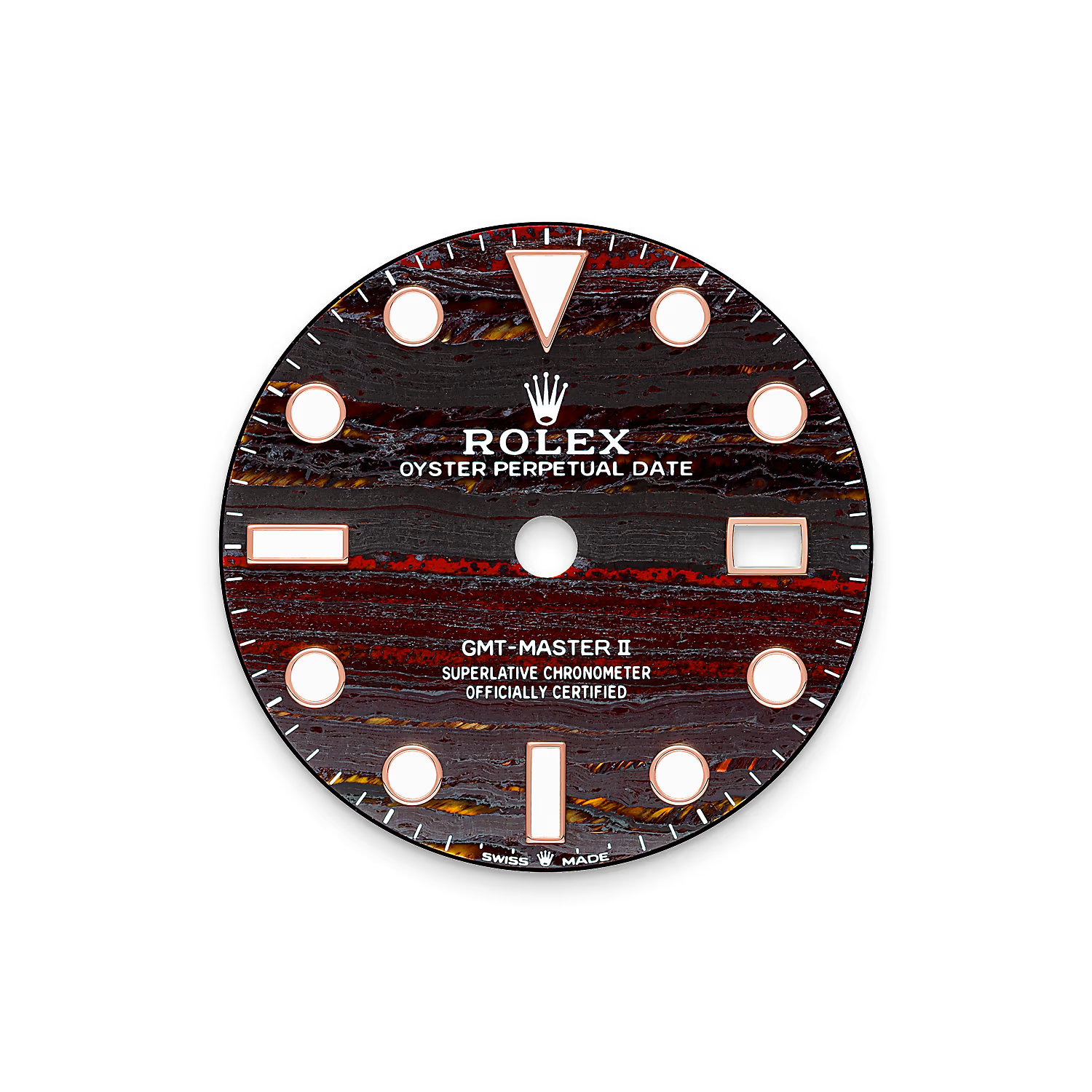 تتميّز ساعة جي إم تي ماستر II هذه بمينا من حجر نمر الحديد. ولأوّل مرة، تستخدم رولكس هذا الحجر المتحوّل في هذه الساعة، والذي يتميّز ببنيته المعقّدة.