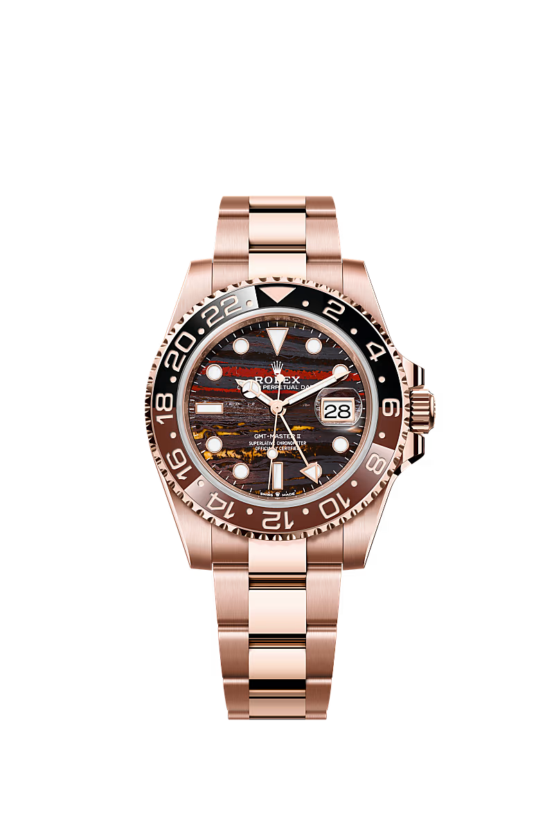 تتميز ساعة أويستر بربتشوال جي إم تي ماستر II المصنوعة من ذهب إيفروز عيار ١٨ قيراطًا بمينا نمر الحديد وبسوار أويستر.