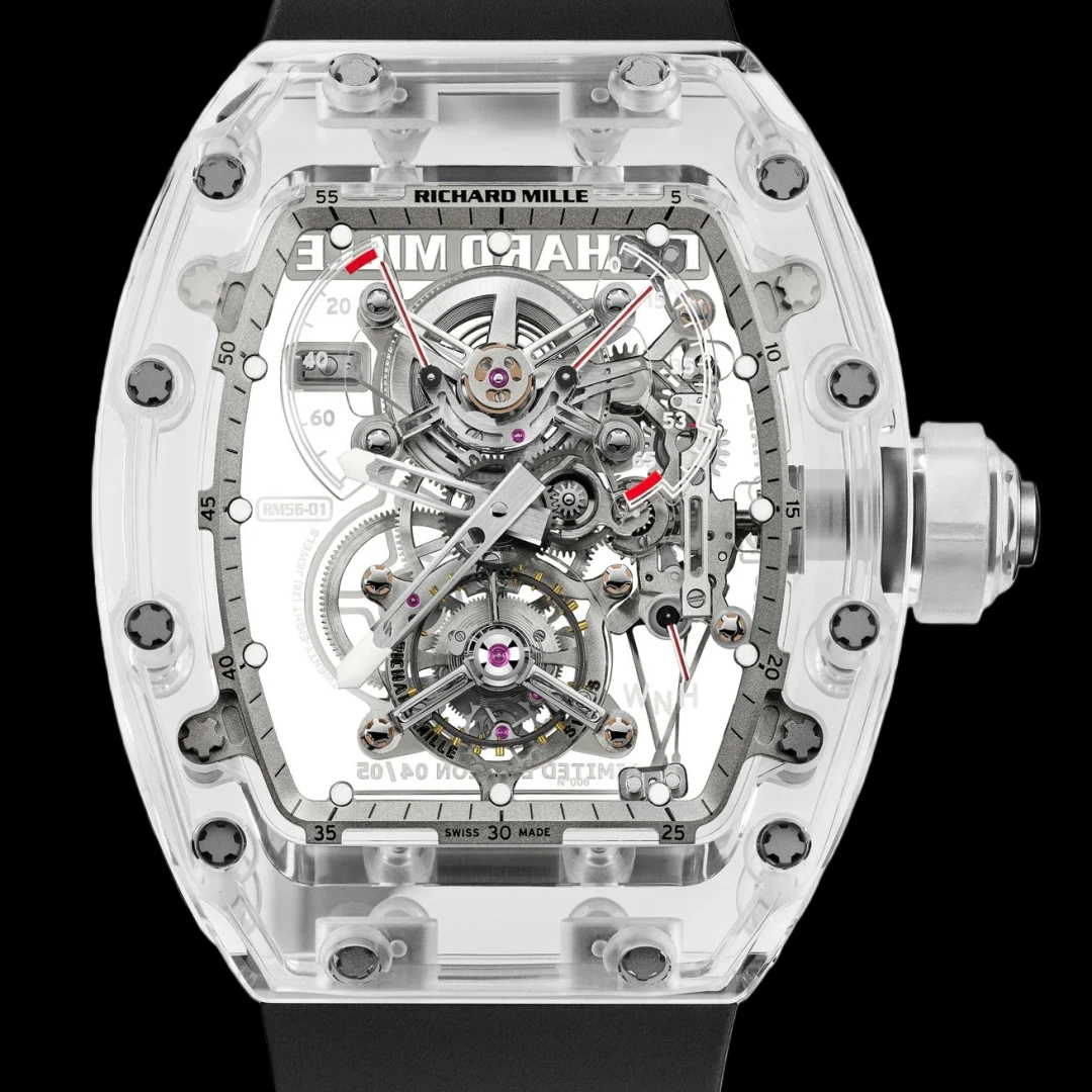 يتمثّل التطور الفريد من نوعه لتوربيون RM 056 فيليب ماسا سباق كرونوغراف الثواني المجزّأة هذا، في أنّ كلّ حواف الواجهة الأماميّة والخلفية للعلبة وغطاءها الخلفي، تمّ قطعها من كتل صلبة من الياقوت وطحنها، لتعطي مظهراً هندسيّاً يتجلّى بقوّة عند رؤيته. استغرق إنتاج هذا الهيكل من الياقوت سنوات من البحث والاختبار من أجل ضمان نسبة استجابة كافية لمتطلبات القوة والراحة.