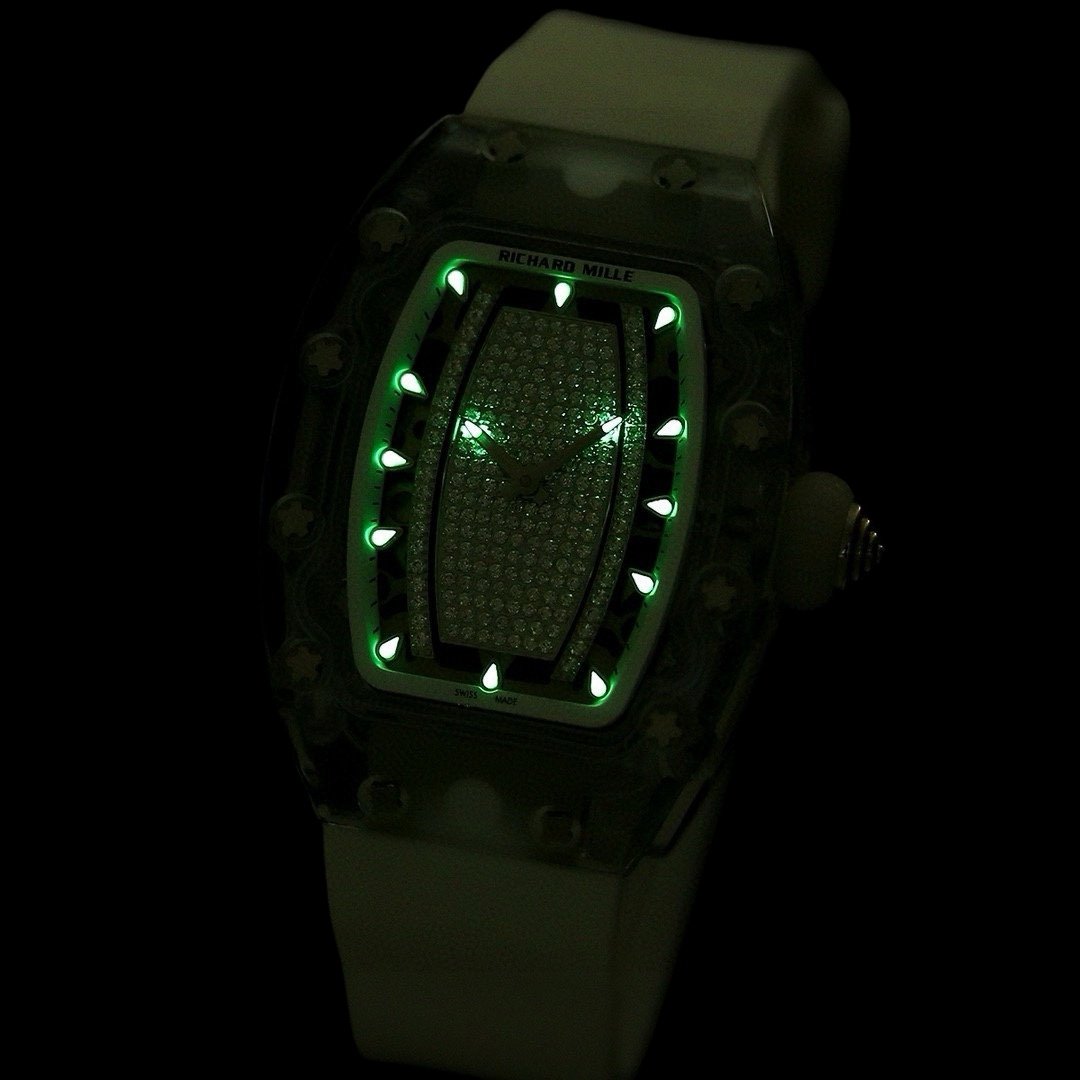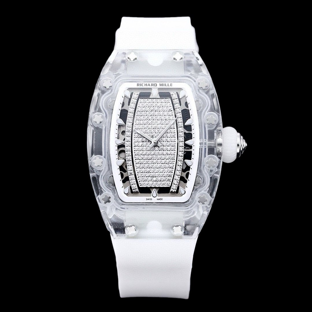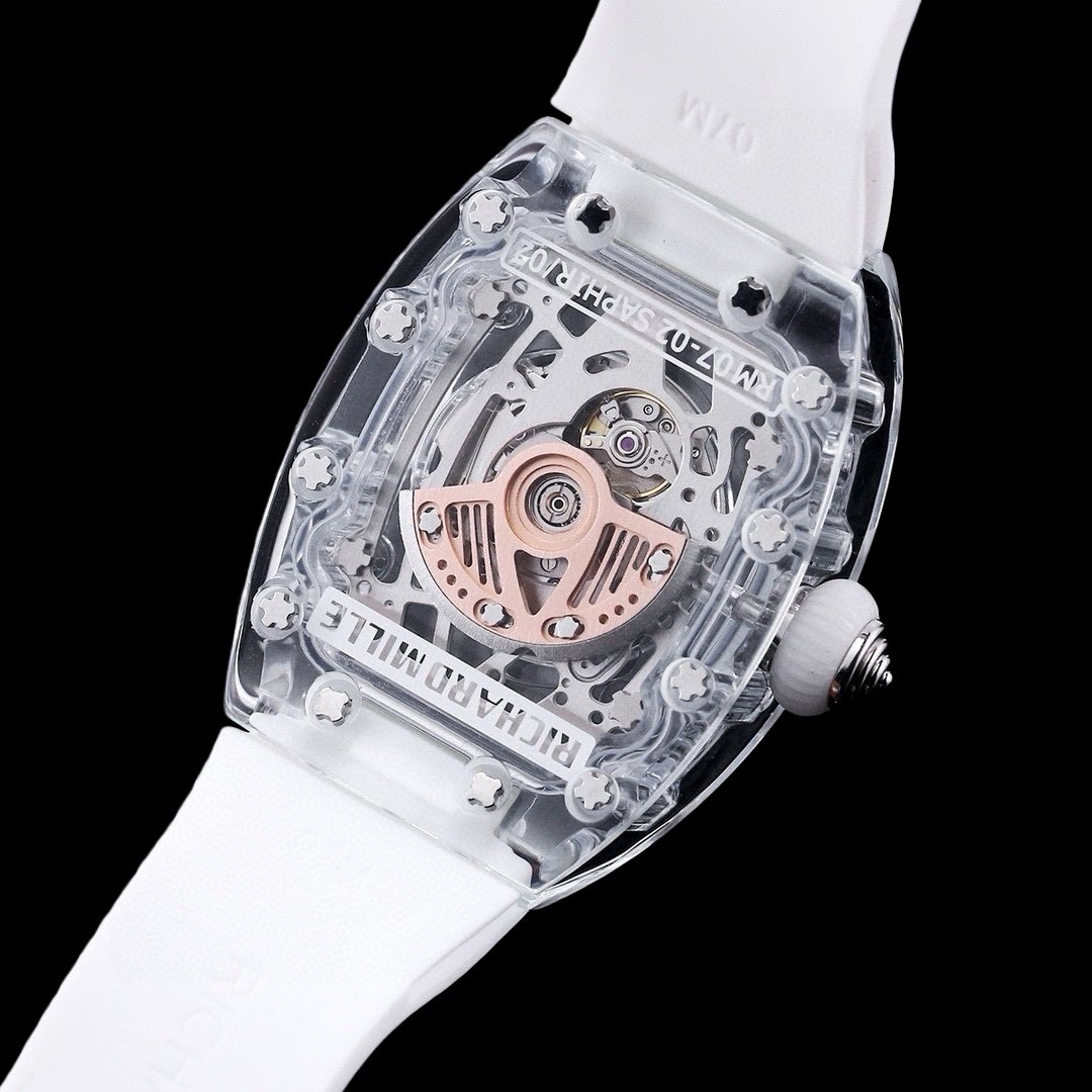 الطراز الجديد من سلسلة RM07-02 – ساعة Gemset Sapphire sapphire، المتوفرة بإصدارات من الياقوت الأحمر والأخضر والأزرق، خفيفة للغاية وتبدو وكأنها جلد ثانٍ! تتبنى الساعة تصميم العلبة المميز للعلامة التجارية وهي منحوتة ومصنوعة من الزجاج العضوي الشفاف! وهي مجهزة بحركة ذاتية الملء CRMA5، ودوار أوتوماتيكي من الذهب الوردي، وتردد تأرجح يبلغ 28800 فولت في الساعة.