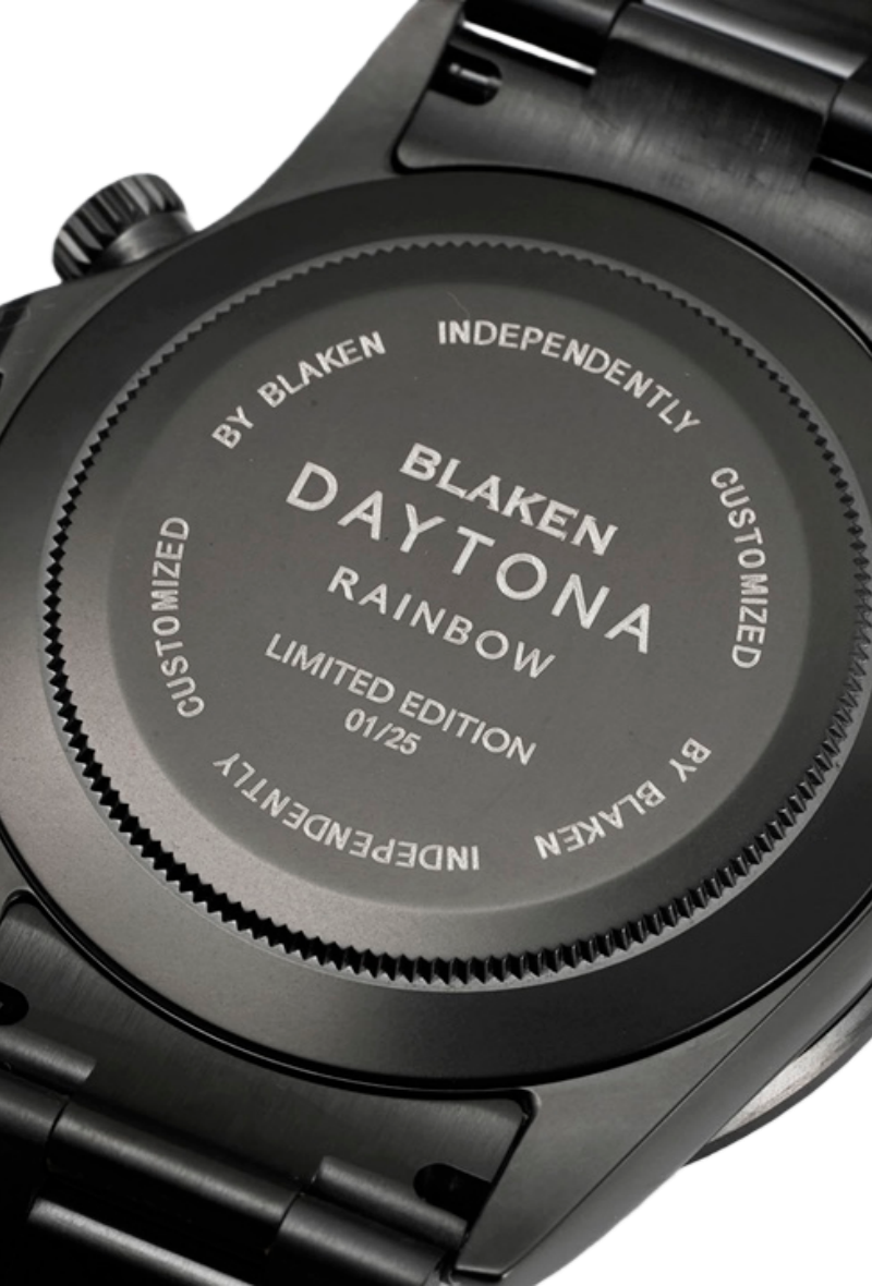 هذه الساعة مُعدَّلة من قبل بلاكن (Blaken) باستخدام أحدث جيل من كاليبر 7750 على أساس رولكس دايْتونا.